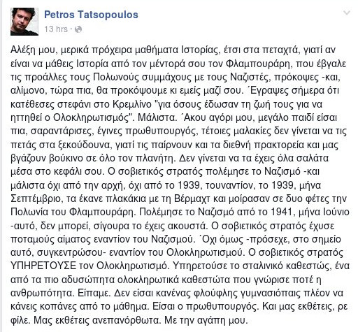 Συγκεκριμένα, ο κ. Τατσόπουλος με ανάρτησή του στο Facebook αναφέρεται στις δηλώσεις του πρωθυπουργού κατά την κατάθεση στεφάνου στο μνημείο του Αγνώστου Στρατιώτη στη Μόσχα